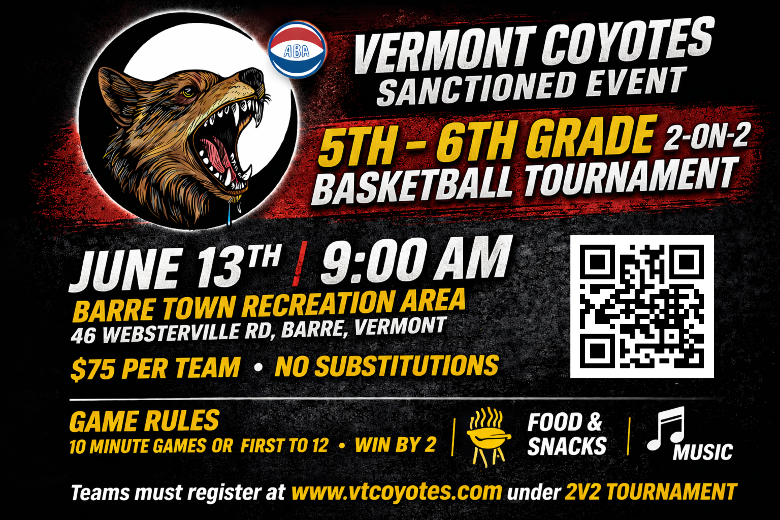 The Vermont Coyotes are bringing an exciting and fun 3v3 basketball tournament to the Barre Town Recreation Area, and this is your chance to get involved, compete, and enjoy a great day of basketball with the community.